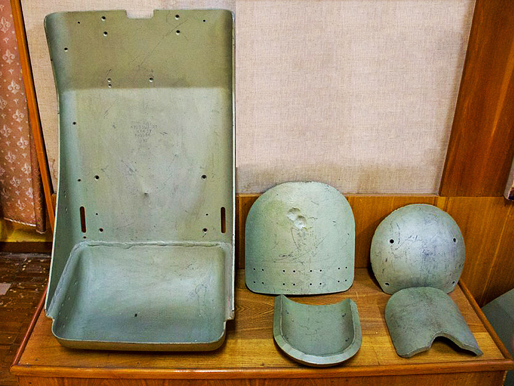 На Фото показаны бронезащита сидения пилота и важных деталей вертолёта. На образце, который находится в середине фотографии видны следы от попадания пуль пулемёта при испытании.