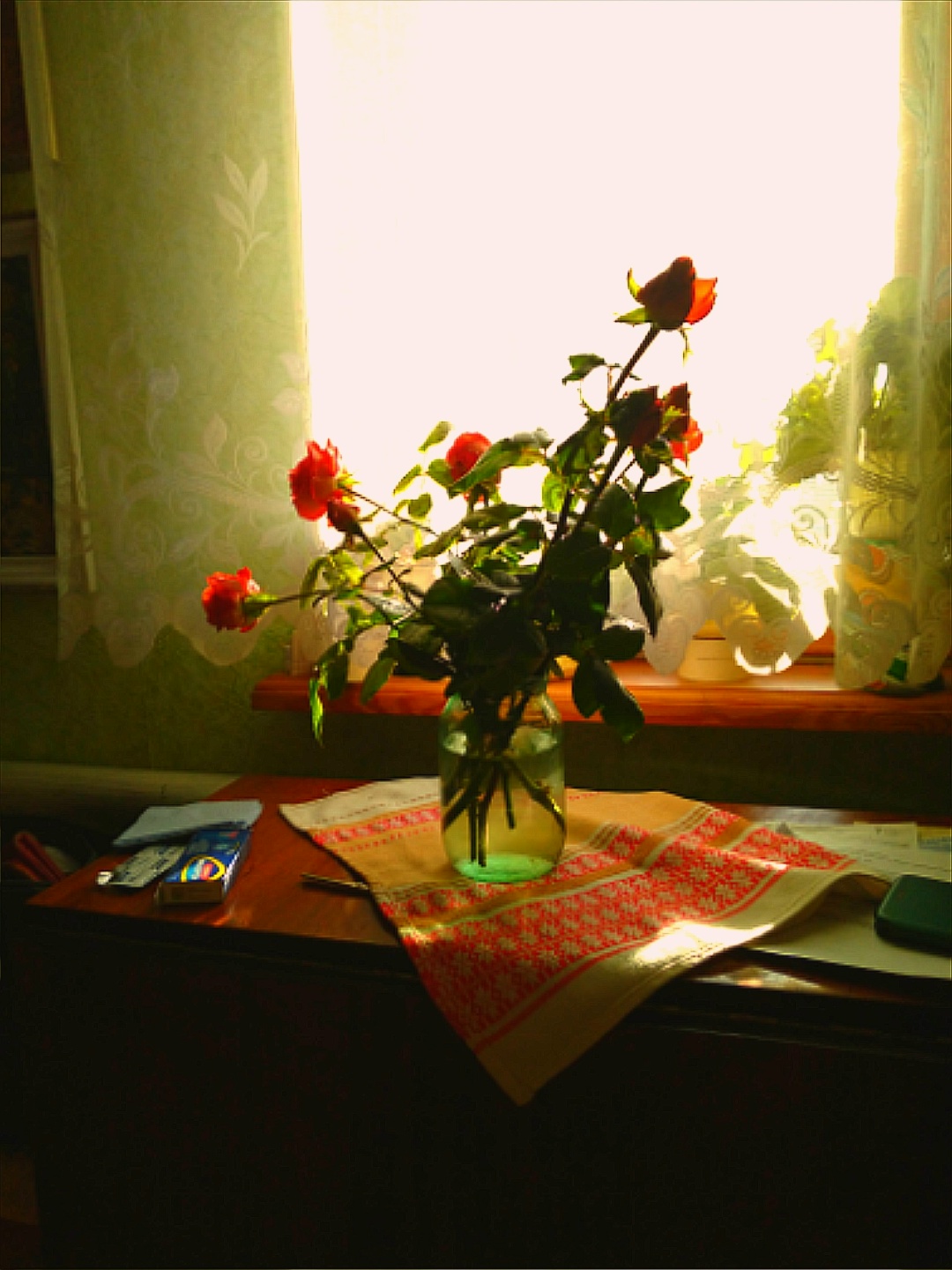 После глубокого утра с тяжёлыми осенними тучами, свинцом смотрящими в окно, и лучами лицом жены, вдруг солнце решило контраст применить. Оно вмиг разметало-раскидало по небу эту грусть-печаль. Ликом, полным радости, впрыгнуло на подоконник, раздвинуло раму. И обняло теплом вазу с красными розами.