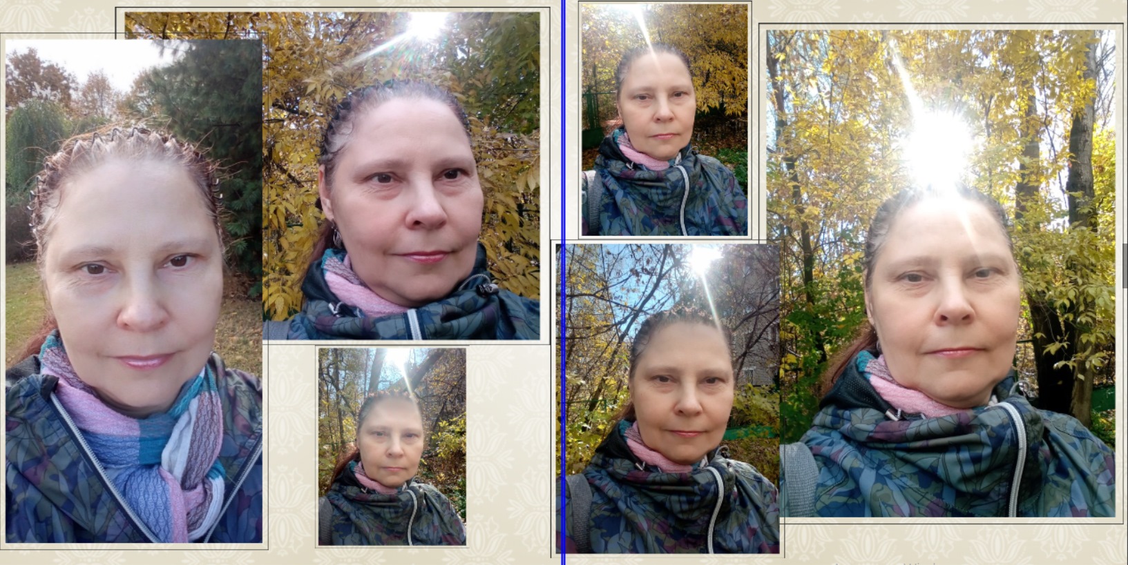 Я шла по рабочему расписанию на автобусную остановку. Было немного за 11 часов по Московскому времени. Ярко светило солнце. На голубом небе были небольшие белые облочка. Золотая осень густо покрыла лиственными коврами газоны и тротуары, тропинки и лужицы. Для похода я выбрала не обычный путь, потому что мне нужно было зайти в рыбную лавку и расплатится за рыбу, которую я брала некоторое время назад. Я сделала это, пошла улочка за улочкой и остановилась на живописном месте. Там было безлюдно. Я сделала несколько фото и несколько селфи. Откуда взялось это свечение над моей головой и солнечный луч с двусторонней указкой: на мой лоб и в небо? Заметив это явление, я намеренно соединилась в единый образ так, чтобы было как у А.С. Пушкина в сказке - "А на лбу звезда горит". Я продолжила мой путь и на селфи, сделанном уже в другом месте - во дворе главного корпуса Казанского университета, мои волосы как антенки со светом соединились. Интересно, я же не первый год живу, почему раньше такого не замечалось? Или это не световой эффект? А всё-таки Знак Свыше?
