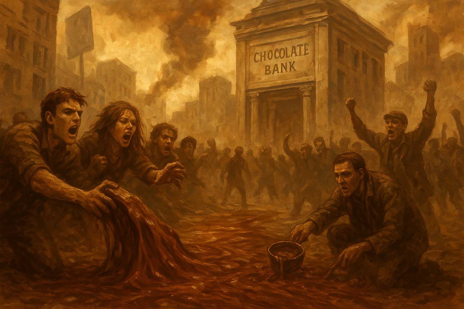 В Италии разгромили главный шоколадный банк — и тысячи людей бросились к плавящимся плитам, зачерпывая их в кастрюли, как золотоискатели воду из реки. Но уже через день жидкая масса прокисла, и драгоценные сбережения превратились в зловонное месиво.