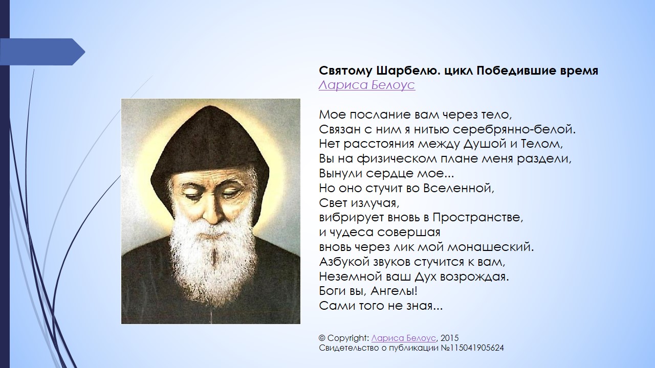 Сегодня мне захотелось поделиться с вами поэтическими посвящениями Святому Шарбелю, история этого святого меня поразила и когда я впервые услышала о нём то тут же распечатала из интернета его фото и стала прикладывать к больным местам или ставить рядом у изголовья кровати. Результат всегда был позитивным даже у тех кто в него не верил, но я всегда с какими-то советами людям которые обращаются с болезнями давала его фото. Конечно же, когда я смогла записывать стихи мне захотелось и ему написать, вернее в сотворчестве с его душой, ведь наши души вечны, мама также поступила и включила своё стихотворение ему в свой цикл Победившие время.
