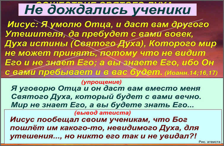 Не дождались апостолы Духа, хотя они в нём и не нуждались, ведь он не мог ни накормить, ни обогреть.