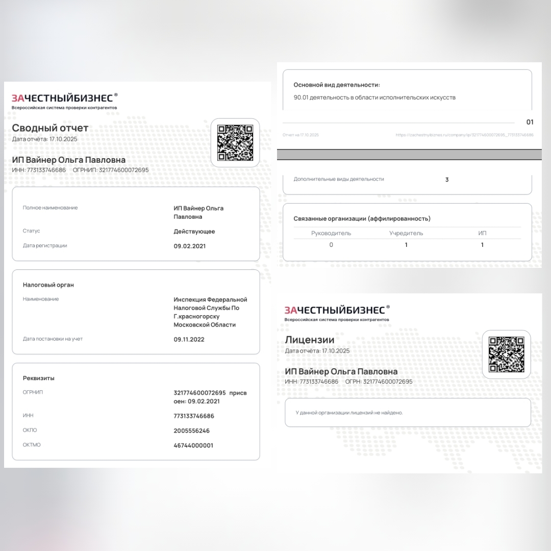Согласно статье 2 Федерального закона «Об лицензировании отдельных видов деятельности» (№ 99-ФЗ от 04.05.2011), выполнение некоторых видов деятельности, включая деятельность в области исполнительских искусств, обязательно требует наличия лицензии. Отсутствие данных о лицензиях может свидетельствовать о несоблюдении требований лицензирования при осуществлении соответствующего вида деятельности.