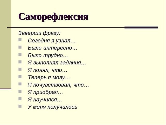 Этот процесс может включать задавание себе вопросов, таких как: "Что я чувствую?", "Почему я так поступил?", "Как мои действия повлияли на других?" Регулярная саморефлексия способствует личностному росту, улучшает эмоциональный интеллект и помогает в достижении целей.