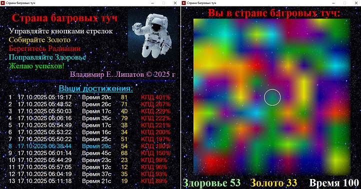 Вы управляете космонавтом, который ходит по планете и собирает золото. Ландшафт планеты всё время меняется. Остерегайтесь красных зон с повышенной радиацией. Поправляйте здоровье в источниках воды. Клавиша пробел - пауза.