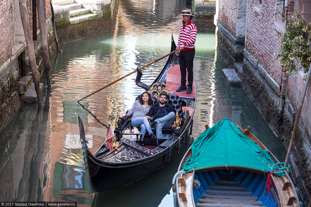 Только после этого они снова вышли на набережную, к двум высоким колоннам, и там взяли гондолу с настоящим гондольером. В эту изящную длинную чёрную лодку с металлическим стержнем на загнутом носу сажают шесть человек, собирая с каждого по 90 евро. И только тогда трогаются в путь - по узеньким, дурно пахнущим каналам.