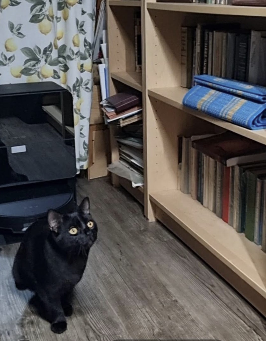 Сегодня выбежал из дома. За дверью, в огороде гулял пес. Кот встретился с ним нос к носу, не ожидал, попытался напасть, испугался, распушил хвост, удрал от пса расколов себе о дорожку когти. Едва остался жив, дышал через раз, не мог промолвить ни одного мяка.