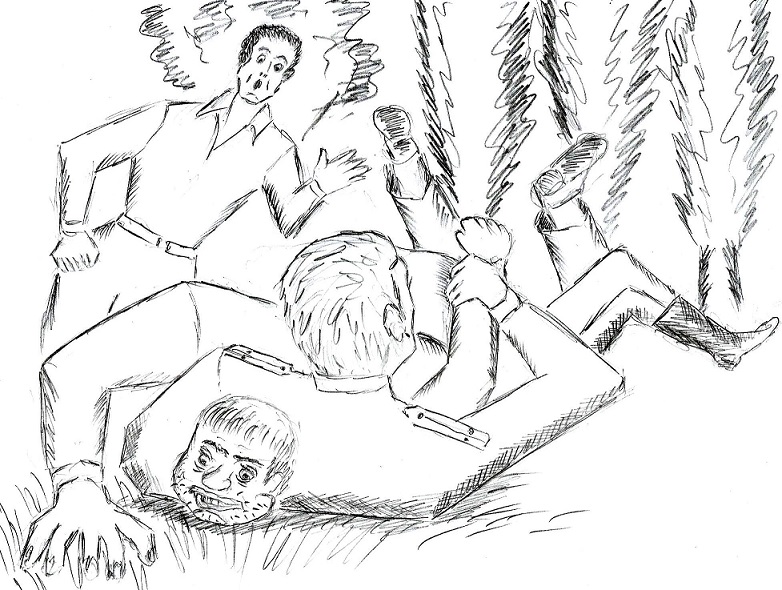 Белая летняя фуражка валялась метрах в пяти, а Валера, в белой летней гимнастёрке, лежал на траве, держа одной рукой в захват подмышкой голову здоровенного мужика, а другой рукой, фиксируя его одну руку. Мужик, таская Валеру по траве, ползал на коленях, пытаясь освободиться и захватить голову Валеры другой рукой. Я подбежал, заломил ему свободную руку и он, заорав, остепенился. Валера застегнул ему «браслеты» на руки за спину.