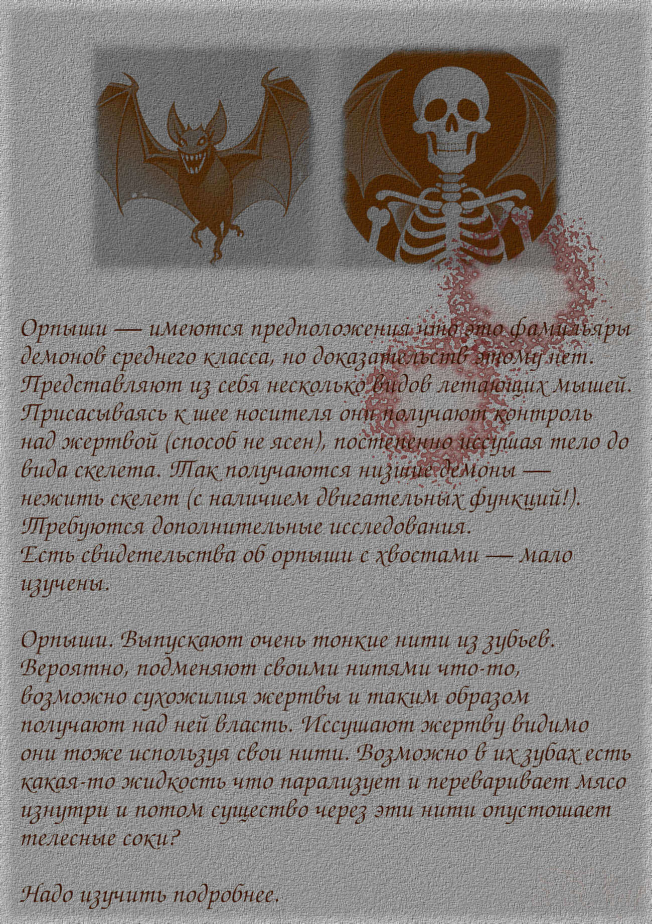 «Орпыши. Выпускают очень тонкие нити из зубьев. Вероятно, подменяют своими нитями что-то, возможно сухожилия жертвы и таким образом получают над ней власть. Иссушают жертву видимо они тоже используя свои нити. Возможно в их зубах есть какая-то жидкость что парализует и переваривает мясо изнутри и потом существо через эти нити опустошает телесные соки? Надо изучить подробнее.»