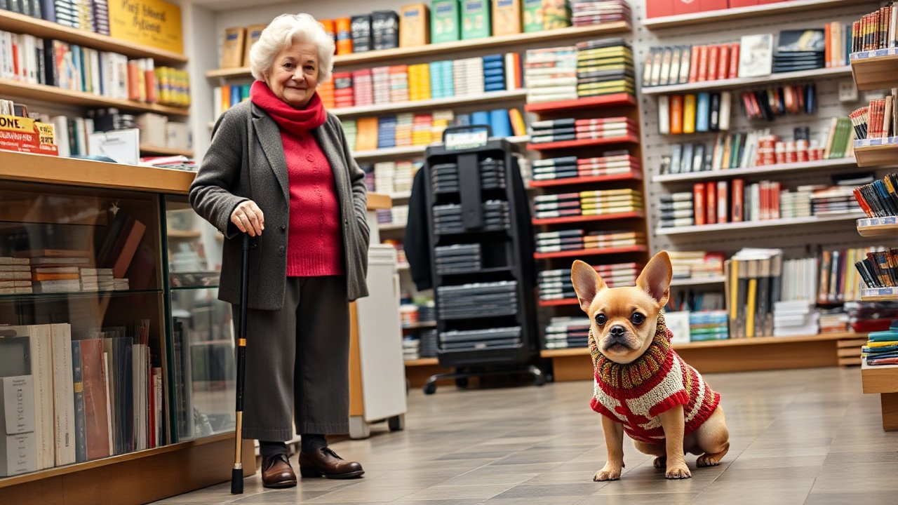 Алёне не хотелось вставать с насиженного места, она решила подождать, но писк не прекращался. Тогда она неохотно встала и поплелась к двери - посмотреть, что за ней происходит. Тут дверь открылась, и в магазин забежала маленькая собачка в цветной вязаной жилетке, без поводка. За ней слегка прихрамывая медленно плелась хозяйка — бабушка с подожком. Собачка несколько раз обежала магазин, пока бабушка покупала стержни. Она частенько окликала её - та прибегала и снова убегала.