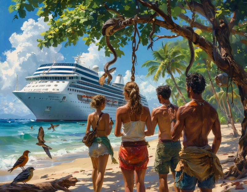 Я вместе с моим новым приятелем бродила вдоль берега и фотографировала всё, что попадалось на глаза: лайнер, диковинных птиц, змей, свисавших с ветвей деревьев.