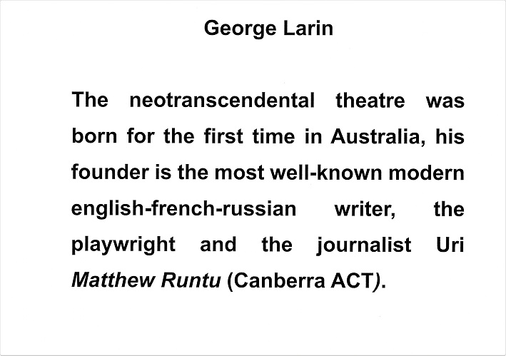 Драматург nla.au/nla.cat- 494 c. TOM - 1: 2022 GEORGE LARIN: URI RUNTU'S PLAYHOUSE: critical reviews: AUSTRALIA: THE NEOTRANSCENDENTAL THEATRE: ART COLLECTION: 1 - 5 PLAYS: 1-20 ESSAYS: 1-st Edition: Hardcover: ISBN 978-1-92527-85-8-3: French: English: Russian: volume 1: 1- 494 pages: Published Canberra ACT Australia: NLA ID 8855253
