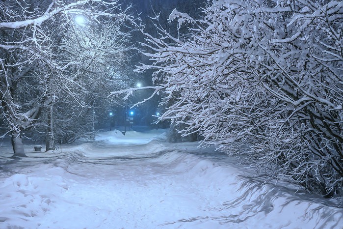 Бриллиантами в сотни карат отражаются в снег фонари.