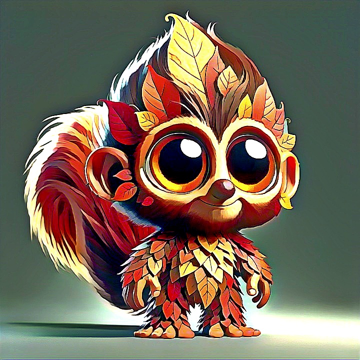 Внешность: Маленький лесовичок с большими выразительными глазами цвета янтаря, серо-зеленой кожей, похожей на мох, и растрепанными волосами цвета осенней листвы. Носит одежду из дубовых листьев и мха, за спиной — рюкзак из ореховой скорлупы.