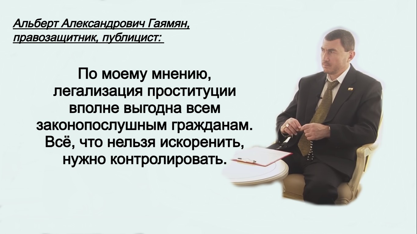 Пятое! Кто заинтересованы в том, чтобы проституция в России оставалась незаконной? Ответ прост — представители криминального мира и коррумпированные силовики. Те, кто с этого аппетитно кормятся… Естественно, в ущерб всем остальным гражданам...
