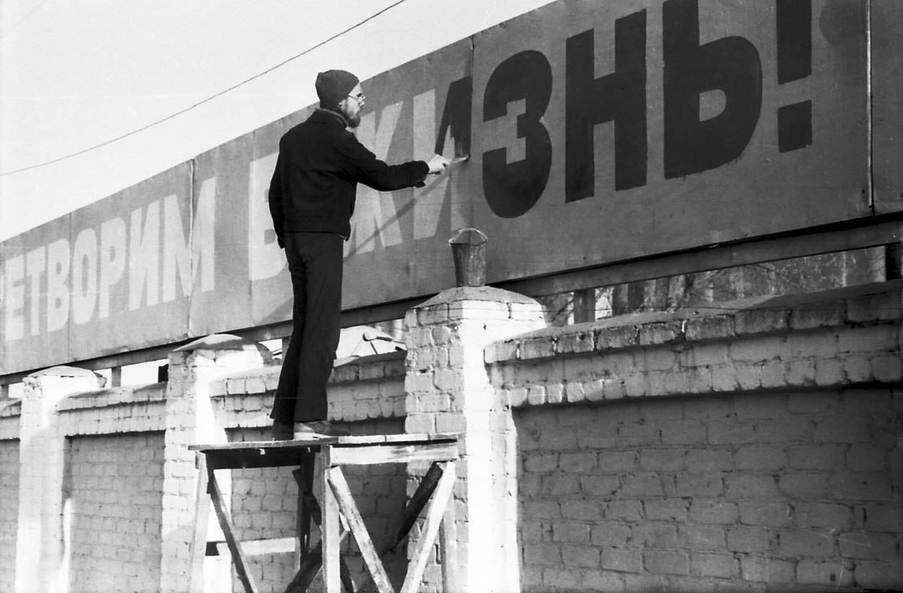 Попытался было решить проблему малой кровью: перекрасить белые буквы в красный цвет. Излишне упоминать о том, что райком КПСС это не удовлетворило… Голубой фон–то остался! В конце концов лозунг пришлось снимать и перекрашивать все, полностью. Белое на красном.