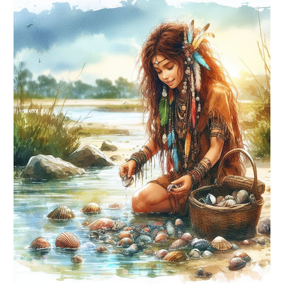 В то же время, у этого берега, Ло гуляла одна одинёшенька. Собирала красивые ракушки, чтобы делать прикрасы нарядные. Увидала парня красивого, полюбила его любовью нежною. Не признала в Мы кочегара чумазого, подошла поближе, и спрашивает : “Кто ты прекрасный юноша? Из каких неведомых стран пожаловал? Человек ты иль бог, с неба сошедший к нам? Вижу больно хорош ты для местного”.