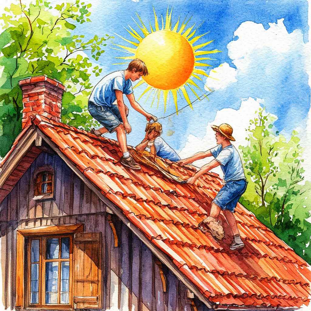Дело спорилось. Парни рвали гвозди монтажками, спускали листы шифера с крыши, штабелировали. Коля бесстрашно бегал по крутому скату, раскатывал и прибивал степлером гидроизоляцию, отмерял расстояния рулеткой, колотил обрешётку. Никита с земли подавал деревянные планки, взлетал по лестнице вверх, бросался вниз, подтаскивал листы металлочерепицы.