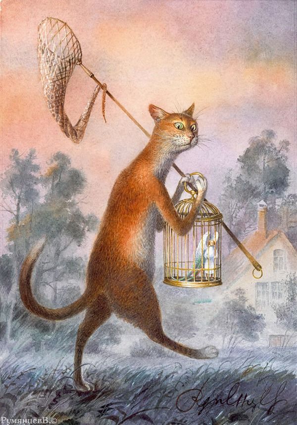 Рано утром кот, покопавшись в кладовой, достал птичью клетку, взял сачок на всякий случай и отправился на луг.