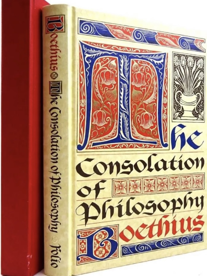 Эта книга называется «Утешение философией», написанное человеком по имени Боэций, когда он находился в тюрьме в ожидании казни в 523 году нашей эры.