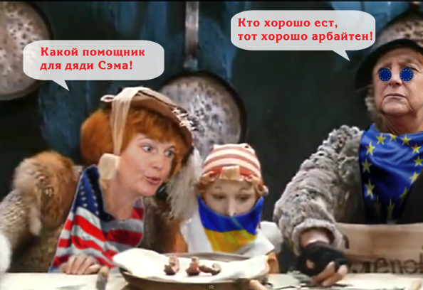 Ждавшие за воротами Лиса фон дер Алиса и кот-мур-р-р Базилио, повели его снова в Таверну, и там снова пообедали (за его счет) тремя корочками хлеба.
