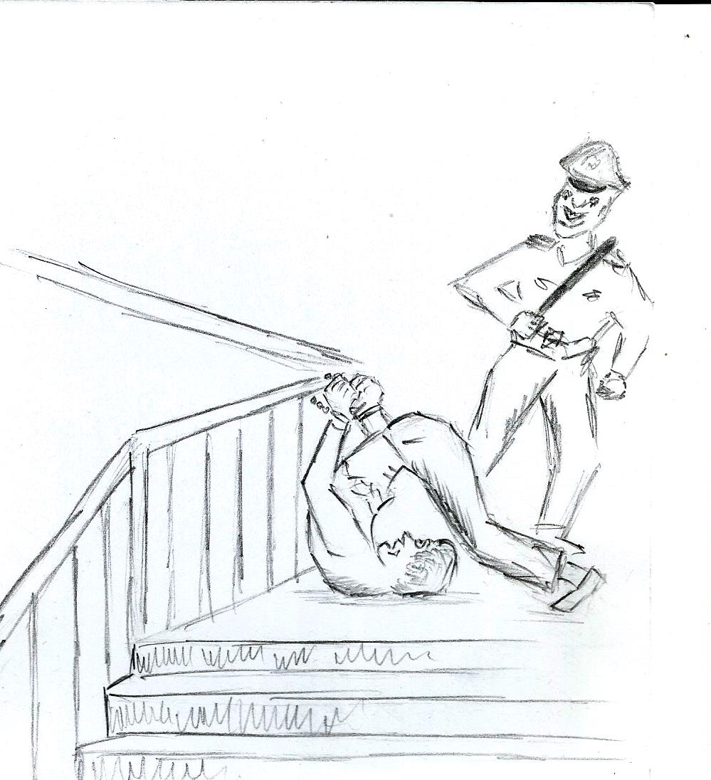 Я был в РУВД в подвальном помещении со следователем райпрокуратуры в допросной комнате, участвовал в допросе обвиняемого. В процессе допроса к нам заглядывали оперативники, следователь выходил, о чём-то вполголоса с ними говорил. Я уловил среди матерных выражений некоторый смысл, мол, «не колется» - говорят они, а он им говорит, ну, сделайте ему «козу», мол что вас учить что ли? Я слышал какой то шум на лестнице, ругань, даже через закрытую дверь, потом стихло и мы продолжали работать, но были слышны какие-то стоны и хрип человека. Мы закончили работу по делу, следователь окликнул конвой и моего подзащитного увели в камеру. Мы взяли свои вещи: он папку, я портфель и пошли на выход к лестнице и я увидел откуда происходит хрип. На повороте лестничного марша к перилам был наручниками пристёгнут мужчина в позе вниз головой, а задницей к верху. Руки у него были за спиной на уровне поясницы и наручниками пристёгнут за перила. Стоял он не на голове, а на затылке, упершись подбородком в свою грудь. Ноги его хоть и были опущены вниз, но доставали до пола только носками обуви. Лицо его было пунцово-красным, как помидор и изо рта шла пена… Наверное это была та самая «коза» о которой я слышал, краем уха.