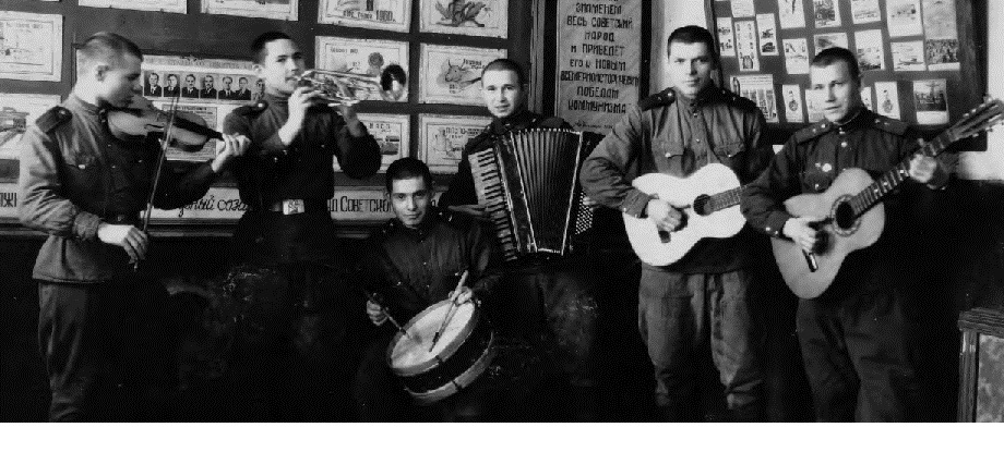 В воскресение учебные классы в школе младших авиаспециалистов не работали. Иногда роты строем ходили в солдатский кинотеатр на 300 мест с балконом. Первая рота жила на втором этаже, а четвертая рота жила под нами на первом этаже. В учебной роте 140 курсантов. Приближалось 40-летие Красной Армии. Школа должна подготовить хор, танцоров и музыкантов для выступления на праздничном концерте в Москве вместе с ансамблем им. Александрова. Хор должен исполнить "Кантату о Советской Армии". Струнный оркестр учил "Рассвет на Москве-реке" из Хованщины Мусоргского, а пляску готовили на тему "Запорожцы пишут письмо турецкому султану". Я, как трубач, попал в группу музыкантов, освоил домру прима-2. Ходили строем после лекции в личное время в клуб и репетировали ежедневно из первой роты певцы, танцоры и музыканты. На снимке: я-трубач рядом с Андреевым-аккордеонистом, земляки из города Октябрьский.