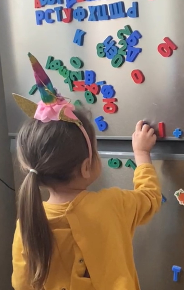 Дома девочки часто играют вместе или изучают книжки, разучивая буквы с холодильника. Старшая сестра уже знает весь алфавит и может составлять простые слова. Младшая не хочет отставать и вместе с мамой выучила почти все буквы.