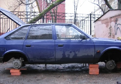Ольга захлопотала вокруг машины, запричитала. А поскольку тогда мобильники еще не были так распространены как сейчас, звонить в милицию (тогда еще) бросились обратно в квартиру. Отняло это времени немного, минут двадцать. Зато когда вернулись обратно, к машине, она стояла уже на четырех аккуратных кирпичных столбиках.