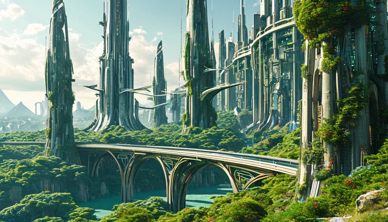 Вера замерла от изумления. Вместо ожидаемых средневековых башен перед ней раскинулся футуристический пейзаж: стремительные башни, изящные арки и воздушные мосты, переплетаясь, создавали сложные узоры против неба. Всё это тонуло в зелени, напоминая скорее цветущий оазис, чем город. Дорога вела к массивным воротам, которые, вопреки ожиданиям, были наглухо закрыты.;