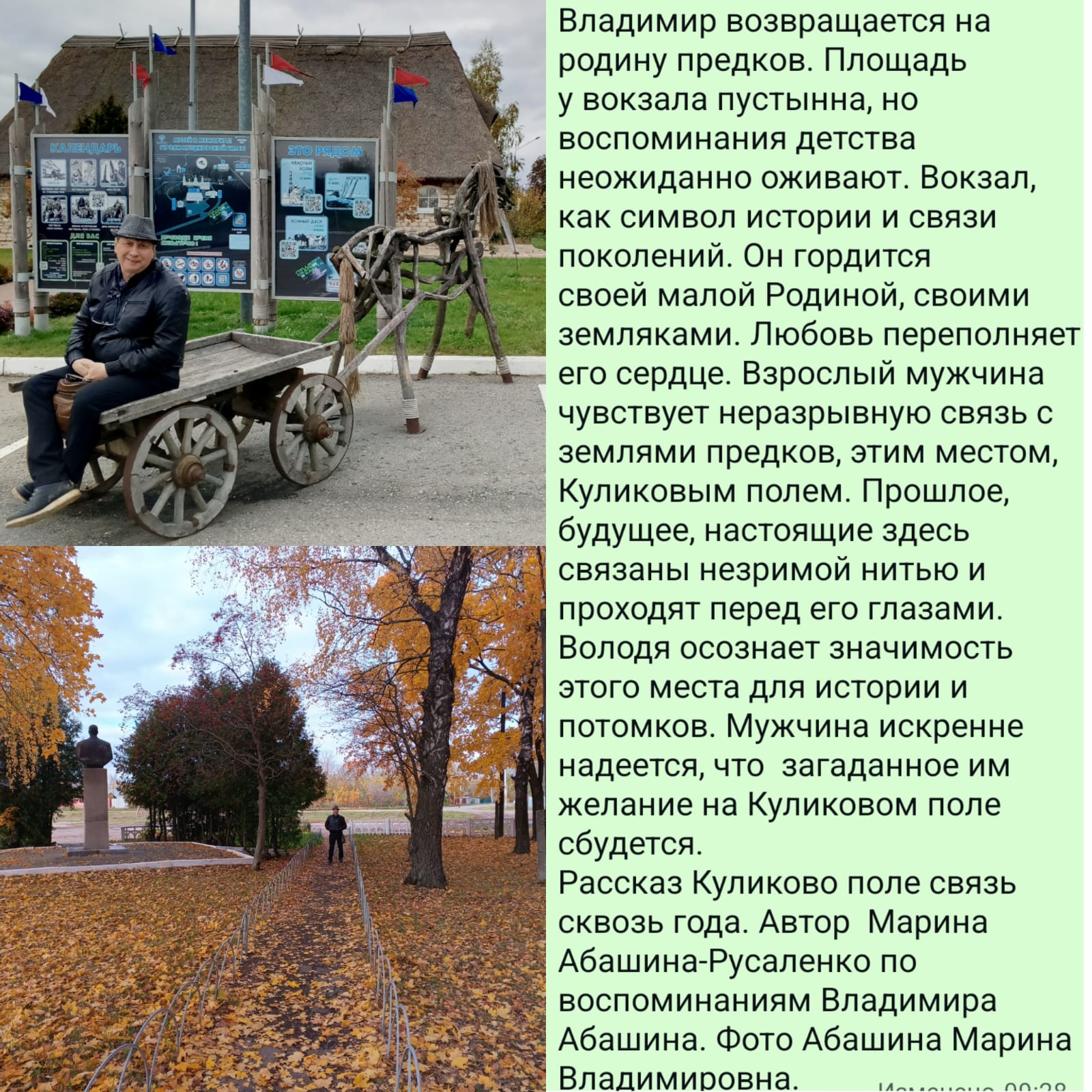 Практически все места, упомянутые в данном рассказе посетили. Много существует фактов, легенд, былин, сказов, а может и выдумки которые передаются в этой местности из уст в уста, поэтому повествование может иметь неточности.Куликово поле связь сквозь года не претендует на научный труд. Он о воспоминаниях, чувствах, эмоциях, любви, гордости, памяти, желании воссоздать и сберечь.