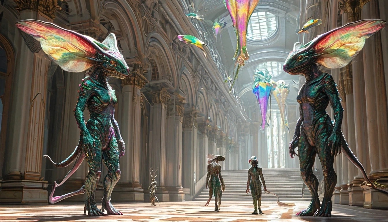 По просторному залу двигались существа самых причудливых видов: вот пара чешуйчатых гуманоидов, похожих на Шии; дальше прошла группа антропоморфных существ с длинными хвостами и ушами, напоминающих огромных мышей; в воздухе плавно парили полупрозрачные создания, переливающиеся всеми цветами радуги.