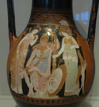 А вот так эта сцена изображалась самими греками. Ваза обнаружена в Керчи. Заметим, что образцом для изображений грекам служили театральные сцены. Также по костюмам и позам современные историки вполне однозначно трактуют изображение как брачный обряд. Неизвестный художник или группа художников, создали настолько самобытный оригинальный стиль, что за ним(и) утвердилось прозвище "Мастер брачных церемоний".