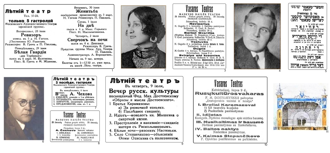 ПРИЕЗЖАЮТ ХУДОЖНИКИ: «Радостная весть взволновала наших театралов. В воскресенье в Летнем театре начинает свои гастроли пражская группа Московского художественного театра. Этот выдающийся художественный коллектив русского зарубежья бережно хранит бессмертные традиции «художников». Имя Московского художественного давно прославлено во все мире. Пражане на чужбине крепко держат знамя родного театра. Везде, где выступала пражская труппа, спектакли были истинными праздниками театрального искусства, вызывавшими восторг у всех, кому близка русская культура и даже у чужих зрителей, не понимавших языка. Ковенская публика проявляет исключительный интерес к спектаклям пражской труппы художников» (не переборщила ли газета из благих намерений?).