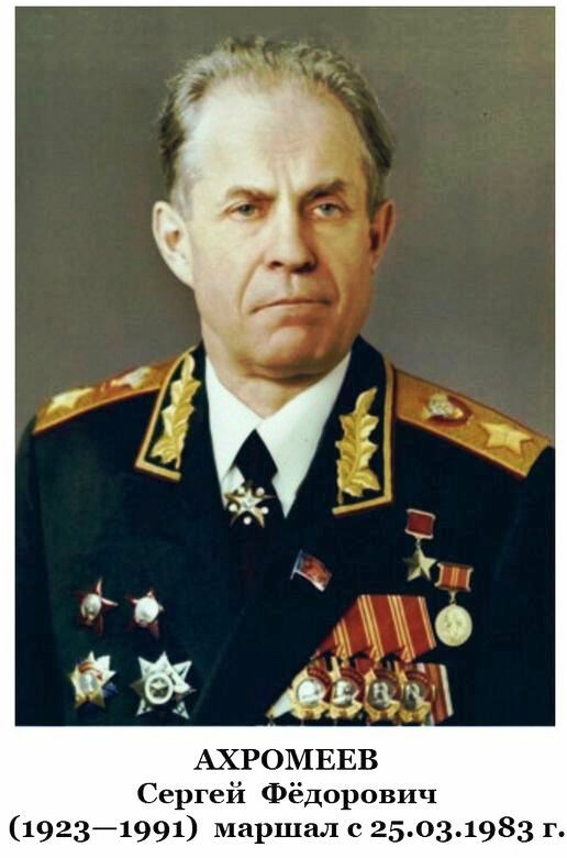 Сергей Фёдорович Ахромеев — советский военачальник, Маршал Советского Союза. Герой Советского Союза. Начальник Генерального штаба Вооружённых сил СССР — первый заместитель министра обороны СССР (1984 – 1988 годы). Указом Президиума ВС СССР от 07 мая 1982 года удостоен звания Герой СССР.