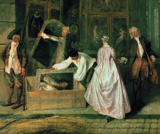 А искусство сегодняшнего (для Ватто) дня -- искусство рококо, главным предметом которого была любовь и прочие развлечения быстротекущей жизни. Кавалер даже берет под руку свою, заглядевшуюся на портрет короля даму, и призывает ее не садится в карету прошлого, а окунуться в настоящее.