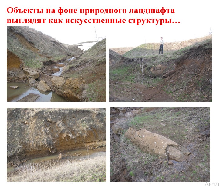 Данные объекты известны людям, живущим в соседнем селе, многие десятилетия. Хоть в 2010 году СМИ и написали о них, будто они во время весеннего паводка были «явлены» впервые. Вы посмотрите на них, даже при первичном взгляде со стороны на эти каменные конструкции, они не выглядят как природные.»