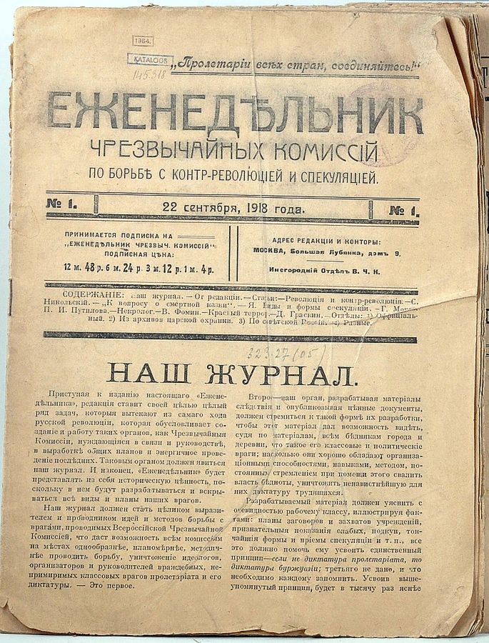 Иллюстрация: 22.09.1918. Журнал «Еженедельник ВЧК» №1.