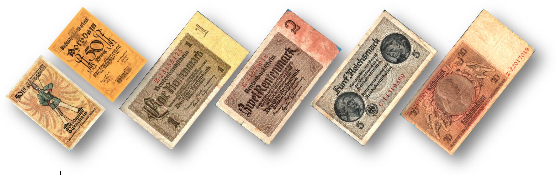 Изображения банкнот номиналом 1 и 2 рентных марки (фото 2-3) , 5 и 20 рейхсмарок образца 1923 года (фото 4-5) показаны над заголовком статьи.