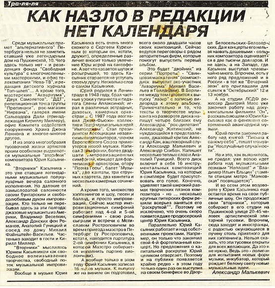 "ВТОРНИКИ" Юрия КАСЬЯНИКА – первый санкт-петербургский авангардный андеграундный музыкальный салон, продолживший традиции знаменитых петербургских художественных собраний прошлых веков, был создан композитором Юрием Касьяником 13.04.1993 г., в его студии – в знаменитом тогда сквоте "Пушкинская-10", одним из отцов-основателей которого он, с весны 1989 г., был и является.