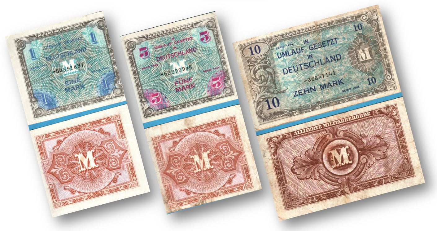 Перевод надписей на аверсе купюр из СССР: «Военные власти союзников», «Введено в обращение в Германии».