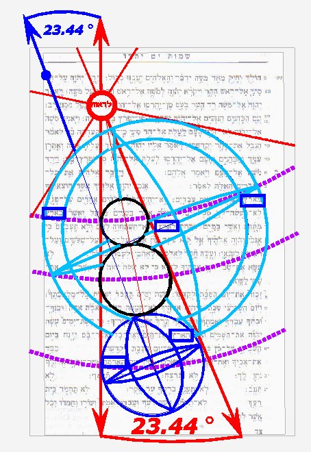 Потому, что слово LIR"OT - УВИДЕТЬ, написанное красным, единственное слово этого корня (основы),под которым, естественно, предполагается источник света, расположено строго симметрично по отношению к системе слов ARETZ - СТРАНА, ЗЕМЛЯ, а ось симметрии будет наклонена ровно на 23.44 градуса к вертикали страницы - вот почему. (См. предыдущий материал) Таким образом, мы наблюдаем нашу Землю, показанную нежно-голубым.