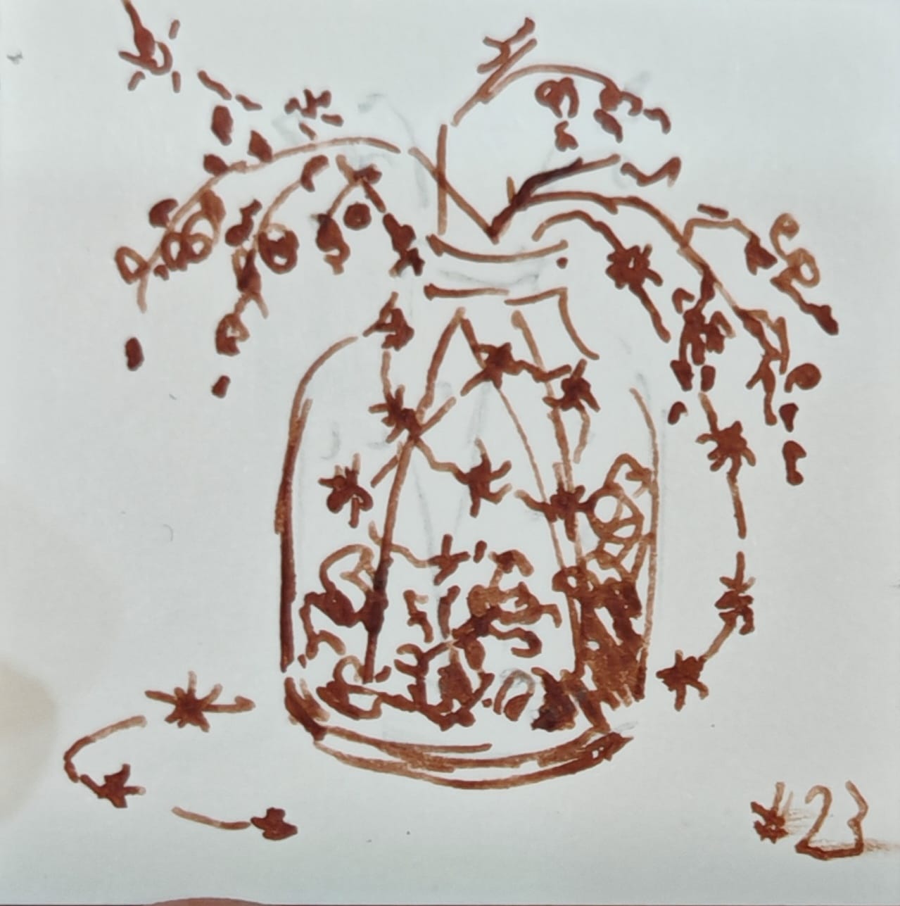 Мия поставила перед собой банку, наполненную орехами, каштанами, яркими ягодами шиповника и светящейся гирляндой и начала ее рисовать…