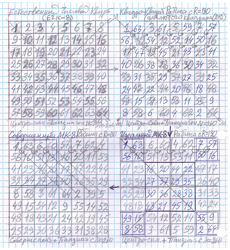 Выше показаны последовательные построения Числовых квадратов из Естественого Числового Квадрата. Три первых квадрата являются центро-симметричными и пандиагональными с М=260, а четвертый – совершенный, а следовательно, тоже пандиагональный.