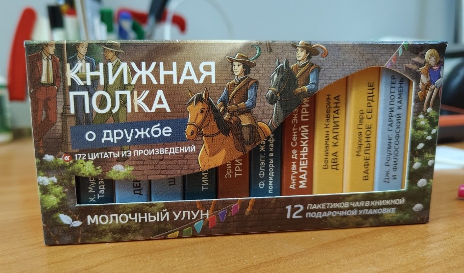 Иногда самые обычные рабочие дни вдруг раскрываются новыми красками. Сегодня офис, привычный в своей суете, будто вдохнул аромат праздника. Меня навестила коллега по перу — Евгения. В руках у неё был необычный дар: чай, спрятанный в коробке, похожей на книжную полку. На корешках «томов» — 172 цитаты из разных произведений. Каждый пакетик — как отдельная страница, как строчка, что можно не только прочитать, но и вдохнуть ароматом.