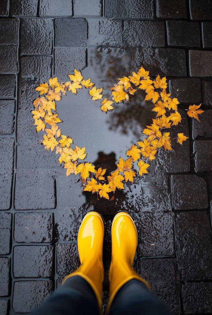 Лужа, как тёмное зеркало, распахнулась в брусчатке, вобрав в себя осеннее небо. На её поверхности золотыми ладонями лёгких листьев сложилось сердце — хрупкое, живое, будто сама осень призналась в любви.