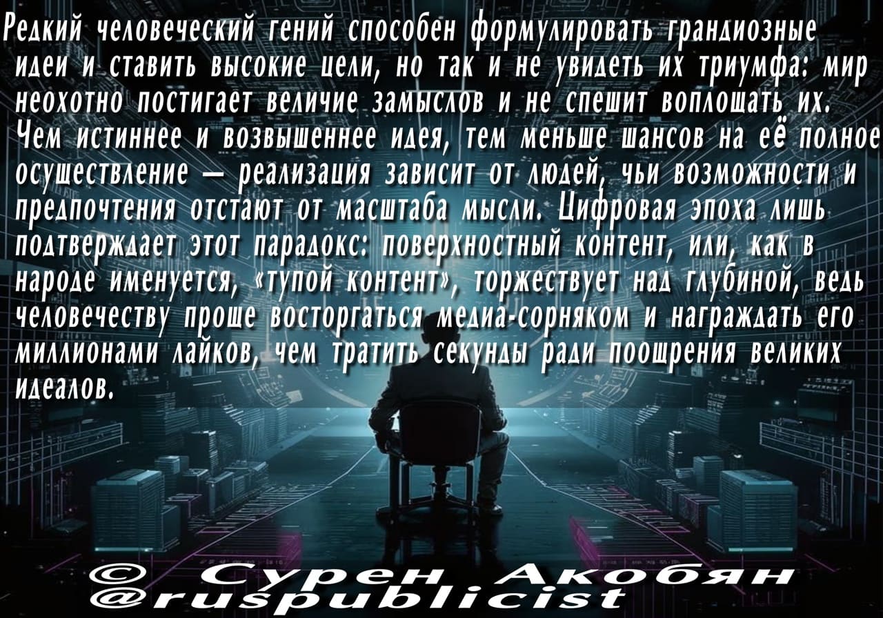 Редкий человеческий гений способен формулировать грандиозные идеи и ставить высокие цели, но так и не увидеть их триумфа: мир неохотно постигает величие замыслов и не спешит воплощать их. Чем истиннее и возвышеннее идея, тем меньше шансов на её полное осуществление — реализация зависит от людей, чьи возможности и предпочтения отстают от масштаба мысли. Цифровая эпоха лишь подтверждает этот парадокс: поверхностный контент, или, как в народе именуется, «тупой контент», торжествует над глубиной, ведь человечеству проще восторгаться медиа-сорняком и награждать его миллионами лайков, чем тратить секунды ради поощрения великих идеалов.