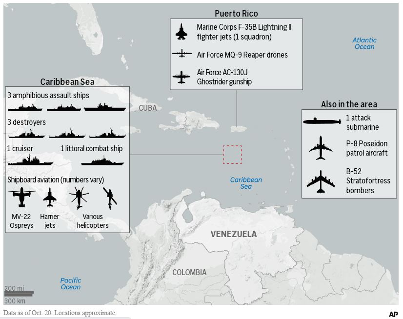 По состоянию на 28 октября, 2025 г., численность американских войск в южной части Карибского бассейна и Пуэрто-Рико увеличилась до 10 000 человек, причем примерно половина из них находится в Пуэрто-Рико, а половина - на судах.