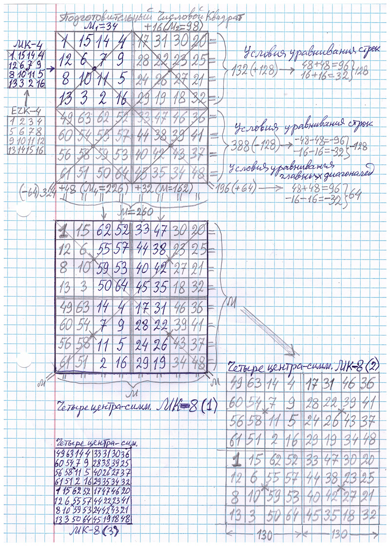 Возьмем любой МК-4, например как указан на рисунке выше. Построим для него Подготовительный числовой квадрат,как на рисунке выше. В нем с помощью условий уравнивания строк до магических сумм М сделаем их Магическими, меняя соответствующие числа в столбцах верхней и нижней половин квадрата, которые не меняют магичность столбцов. Выбрать их можно разными способами (например показанными на рисунках выше).