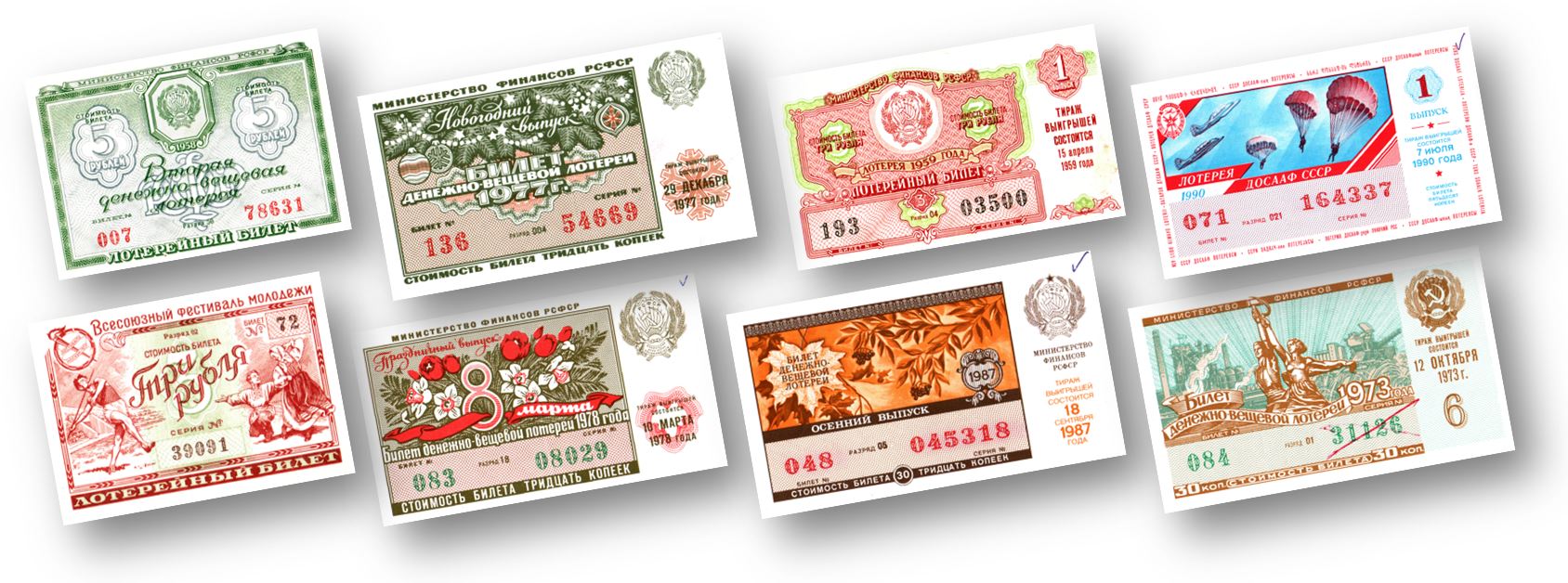 Первая послевоенная лотерея была организована в 1956-м в рамках подготовки страны к проведению VI Всемирного фестиваля молодёжи и студентов. Ещё три раза проводились фестивальные лотереи.